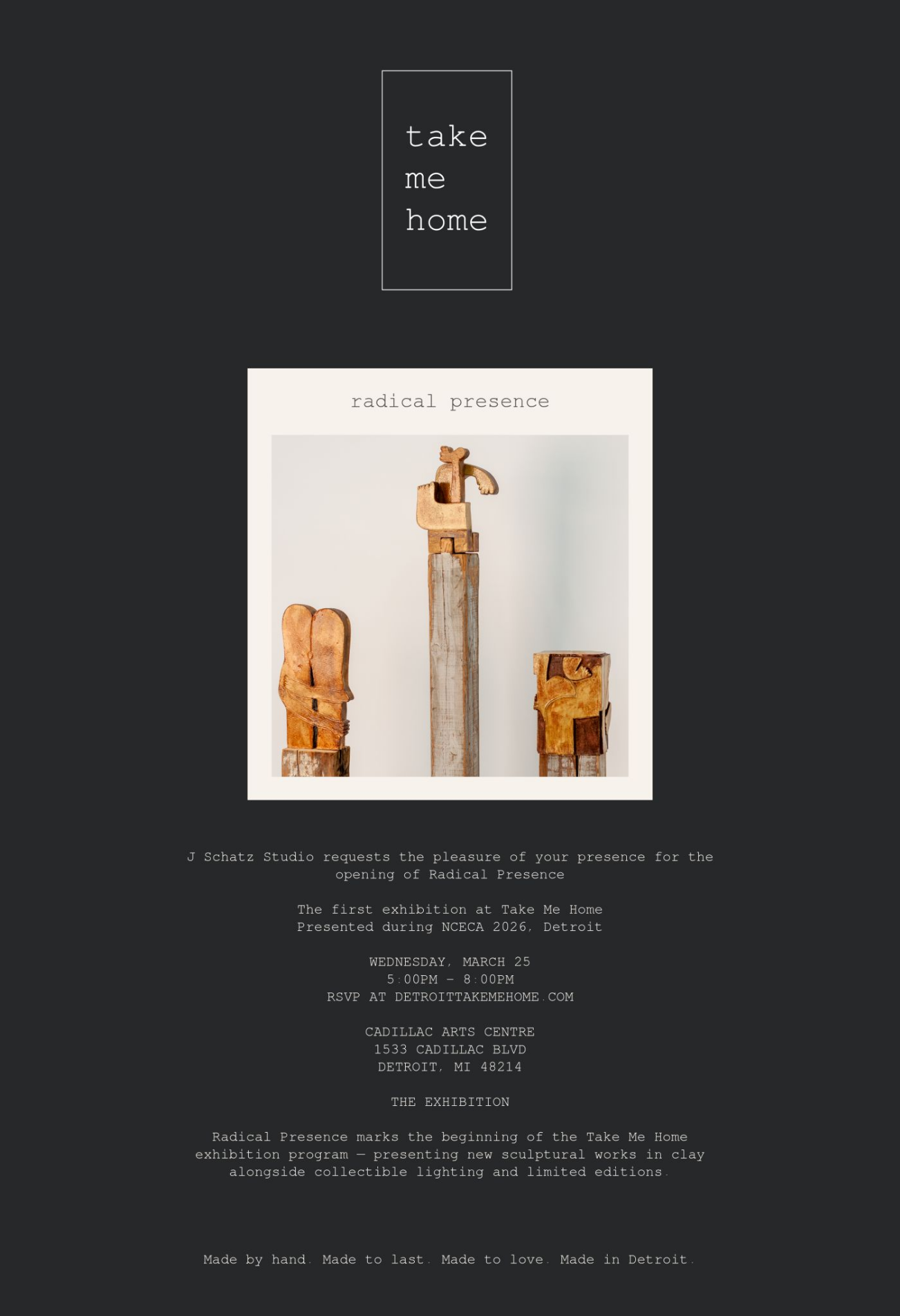 Take Me Home is conceived as a living extension of J Schatz Studio — a place for collectible design, presence, and permanence.