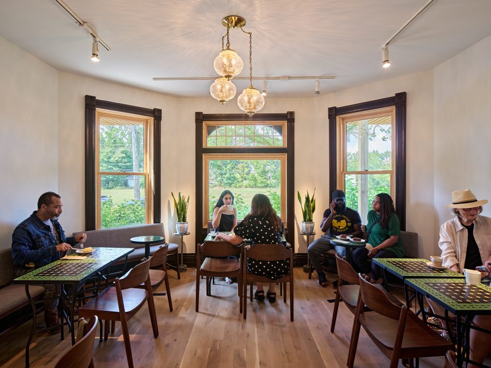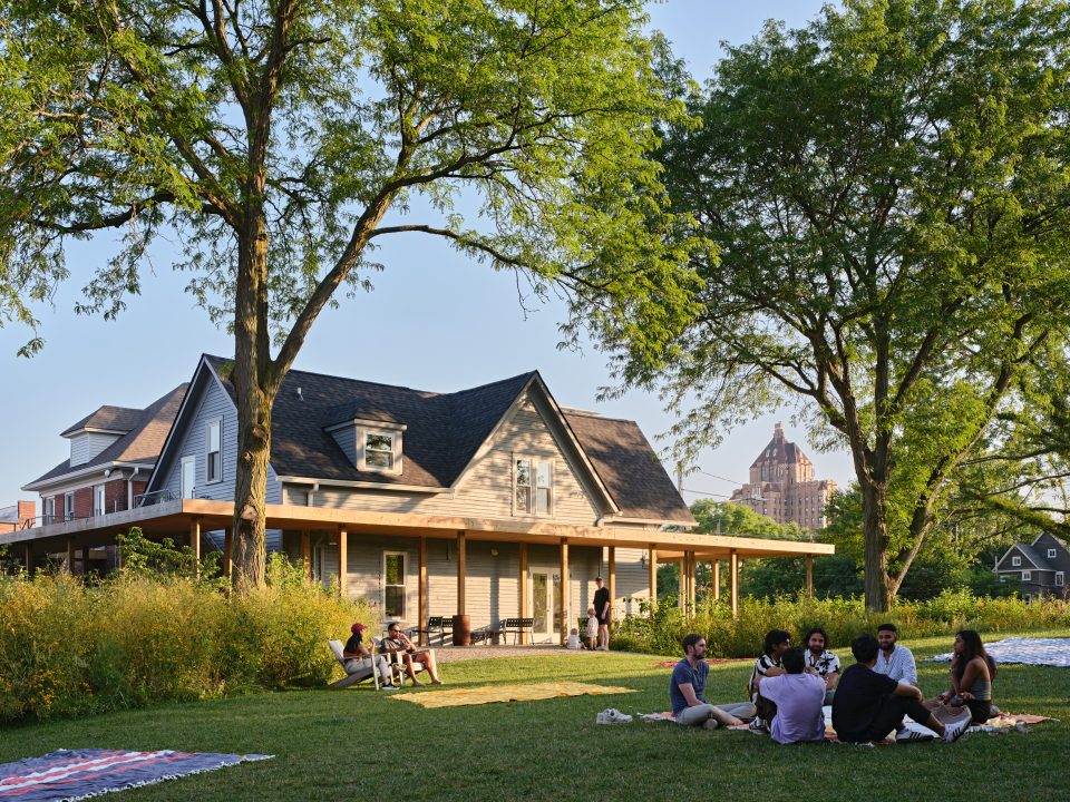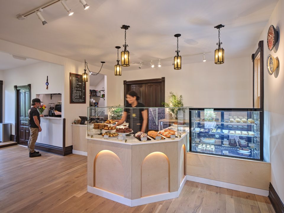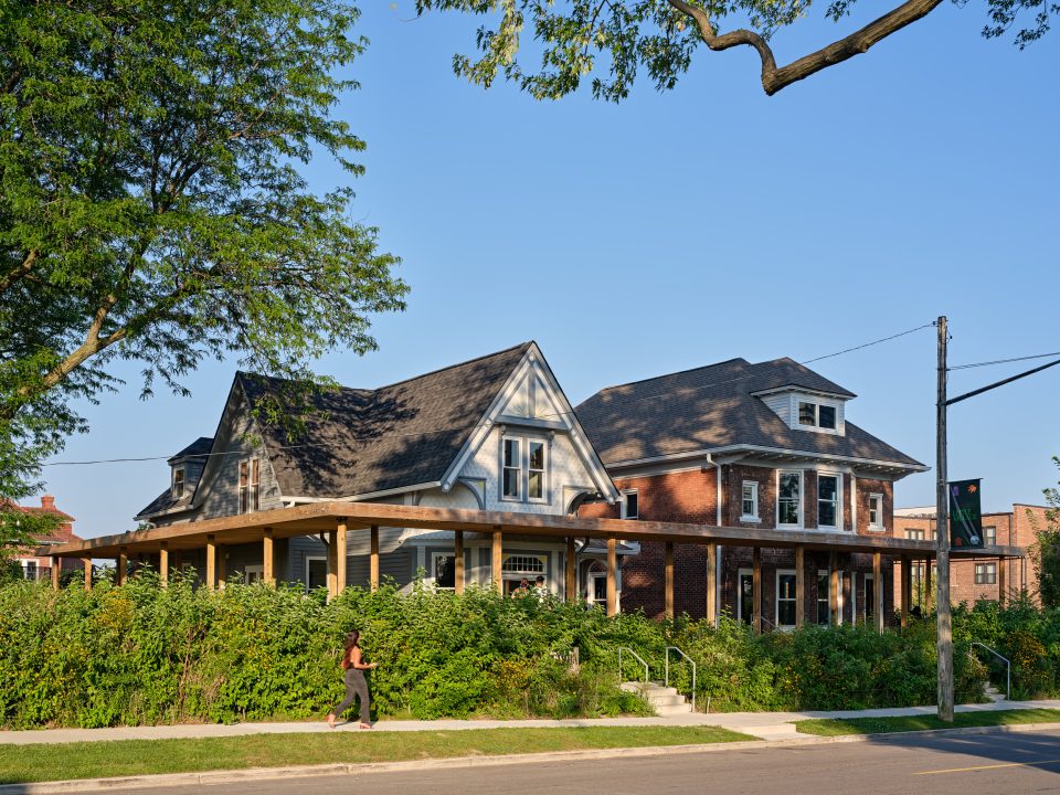 Immediately behind the Shepherd is BridgeHouse, consisting of two former residential structures now transformed into commercial spaces aimed at the culinary arts. Conceived by architect Ishtiaq Rafiuddin of Detroit-based studio Undecorated, BridgeHouse is encapsulated within a two-story deck, which provides outdoor space and viewing opportunities into the skatepark and grounds while functioning as a stage for intimate performances. Within BridgeHouse, Warda offers a seasonal menu of French-inspired pastries and breakfast fare from James Beard Award–winning chef Warda Bouguettaya.