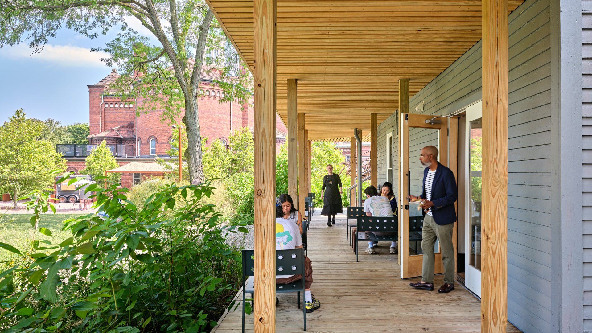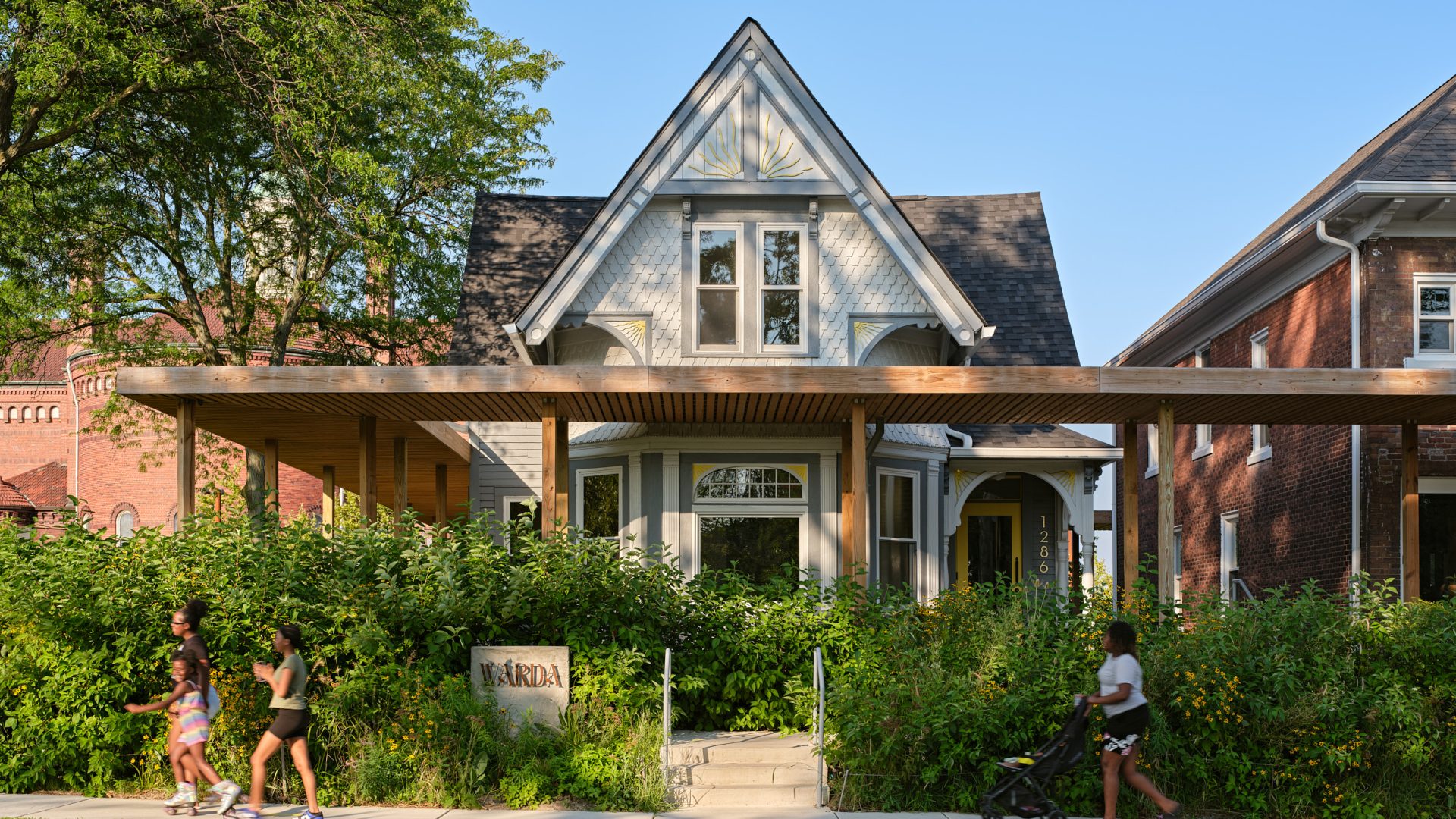 Immediately behind the Shepherd is BridgeHouse, consisting of two former residential structures now transformed into commercial spaces aimed at the culinary arts. Conceived by architect Ishtiaq Rafiuddin of Detroit-based studio Undecorated, BridgeHouse is encapsulated within a two-story deck, which provides outdoor space and viewing opportunities into the skatepark and grounds while functioning as a stage for intimate performances. Within BridgeHouse, Warda offers a seasonal menu of French-inspired pastries and breakfast fare from James Beard Award–winning chef Warda Bouguettaya.